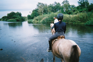 北海道旅行の締めくくりは、千歳空港からそう遠くないホースガーデンMURANAKAで外乗。ここは北海道に来るたび必ず顔を出しているので、ホントにすっかり顔なじみです。 少し早めに到着すると、ムラナカさんはいない様子。外乗にでも出ているのでしょう。ここはムラナカさん1人でやっているので、これもよくあること。勝手が分かっているので、放牧地にいる仔っこをかまいながら待たせてもらいます。 ほどなくして、ムラナカさんが外乗から戻ってきました。ムラナカさんが先導で乗る雪柳ちゃん、わたしが乗せてもらうことの多い鈴姫ちゃん、相方がよく乗る和姫ちゃん、みんな元気そうです。 しばらく休憩してからでもいいと思っていたのですが、ムラナカさんが大丈夫だというので、すぐ出かけることになりました。騎乗して、ムラナカさんが「これくらいかな?」と合わせてくれた鐙は、わたしにはずいぶん短いよう。 わたしは鈴姫に乗ってムラナカさんのすぐ後ろ、相方は和姫に乗って最後尾で敷地の外に出ます。いつもの草地を抜けて川沿いの道に出る途中、できている道を少し外れたがる鈴姫。初めて乗ったときには先導馬を抜くんじゃないかと思ってヒヤヒヤしたけど、今はただ足元の石が気に入らないだけだと分かってる。どさんこは足元も爪も丈夫だけど、鈴姫は蹄底に石が当たるのがキライらしいのです。 上り坂でムラナカさんが速歩を出すと、すぐに鈴姫も速歩になりました。どさんこ特有の側対速歩(右前と右トモ、左前と左トモがセットで前に出る。軽種だと右前と左トモ、左前と右トモがセットですよね)の乗り心地は楽ちんなので、軽速歩もへったくれもなくそのまま座って速歩。でも速歩だと鈴姫ちゃんはあんまりスピードがのらず、先導の雪柳ちゃんに置いていかれがち。 じゃあ駈歩出しちゃいな、と腹を蹴っ飛ばすと、鈴姫ちゃんはあっさり駈歩になって雪柳ちゃんに追いつきました。しかも、追いついても駈歩のまま。いや、鈴姫のクセを知ってるからやってるんですが、この子はどさんこのくせに速歩より駈歩のほうがラクらしいのです。普通はどさんこってあまり駈歩したがらないらしいんですけどね。 小さなダムのわきを通り、小さな道を下るところで、鈴姫が[アタシこんなとこ降りないもん]と言い出しました。アンタいつも通ってるんでしょうが。ワガママするんじゃないよ。 馬を回してもう一度通らせようとすると、今度は後ろにいる和姫に[アンタなんでアタシの後ろについてきてんのよっ!]と突っかかっていきます。でも和姫も[アンタこそなんでアタシの前歩いてんのよっ!]と負けていません。あんたたち、要するに仲いいんじゃん?(笑)叱りとばして下り道に入らせます。 速歩と常歩で林を抜けて広い道に出ます。すると足下の土にたくさんのキャタピラの跡、そしてその先にはジープや装甲車(らしきもの)。ここは自衛隊の演習場に近く、以前にも空砲を聞いたことがありますが、出くわしたのは初めてです。 もう演習が終わって移動するところだったようなので、その場でしばらく待つことにしました。でもこれだけのでっかい車が目の前でぞろぞろ動き出すと、いくらどさんこでもビビるんじゃないかしら。まぁ鈴姫ちゃん程度ならちょっとくらい暴れてもどうにかできると思うけど。 そんな心配をよそに、動き出した装甲車にビビっていたのは雪柳ちゃんだけで、鈴姫ちゃんも和姫ちゃんもとくに驚いた様子はありませんでした。 装甲車がいなくなったので外乗を続けると、今度は橋の向こうからたくさんの装甲車が列をなしてやってきました。この橋はそもそも自衛隊の専用道路だそうで、こっちが使わせてもらっている立場ですから、待たざるをえません。ここでも雪柳ちゃんは驚いてパタパタしていましたが、鈴姫と和姫はどこふく風で草を食べていました。 大きいバイクがやってきたときだけ、さすがにムラナカさんが「あれは急に大きい音がしたりするから、ちょっと手綱控えてて」と言い、手綱を控えて何かあっても対処できるようにしておきましたが、バイクはおおきくふかしたりしないでくれたので、問題ありませんでした。 さて、このコースに出たからには、川渡りをしなければ気がすみません。前日の雨もこのあたりには影響がなかったようで、水量はあまり多くありません。 昨年は鈴姫に途中で道草を食わせなかったため、川に入ったところで鈴姫がキレて川面をたたきまくった(笑)という事件があったので、今年はある程度道草も食わせています(止まらなければね)。でも「今年もばっしゃんばっしゃんやるかなー」とわたしがつぶやくと、ムラナカさんが振り返って「今日はやらないと思うよ」。その言葉通り、鈴姫ちゃんはワガママをすることなく川を渡りきり、水際を上りました。 1時間半の外乗を終えて、そのあともムラナカさんとしゃべりまくり。危うく帰りの飛行機に乗り遅れるところでした(笑)。 だいたい毎年同じコースで