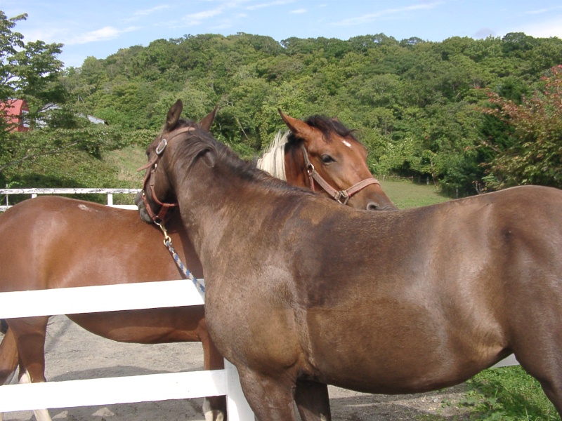 手前がアップルちゃん、奥は相方が乗ったブラウンちゃんの娘、クーリエちゃん。なんだか仲良しで、柵ごしにグルーミングしたり鼻をくっつけあったりしていました。