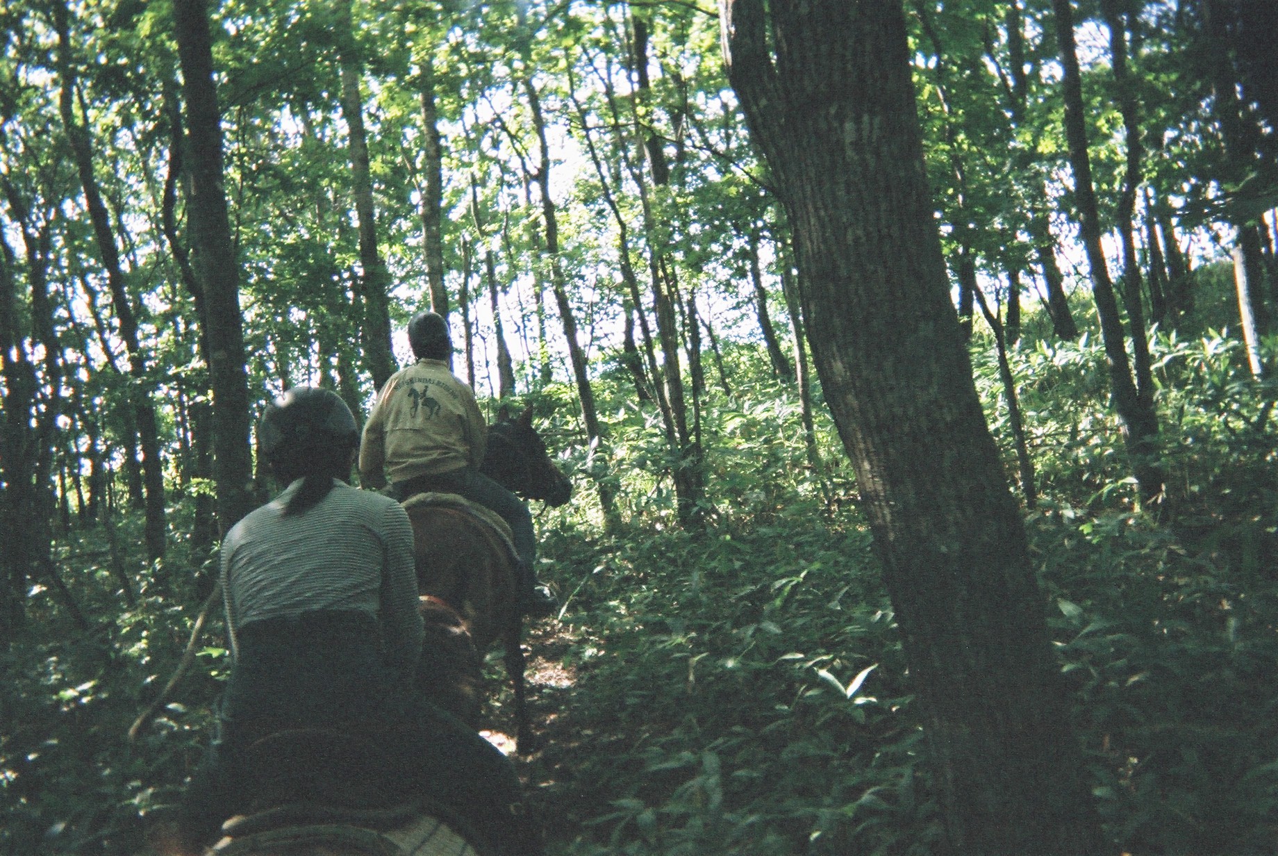 その草原を、駈歩と速歩を混ぜながら2〜3周するうち、それなりに勝手がつかめてきました。「じゃあここからちょっと林に入りますね」と、いきなり横道から林の中へ。それなりに傾斜もあり、前日までの雨風で少し不安定なところもあるので、ゆっくり進んでいきます。