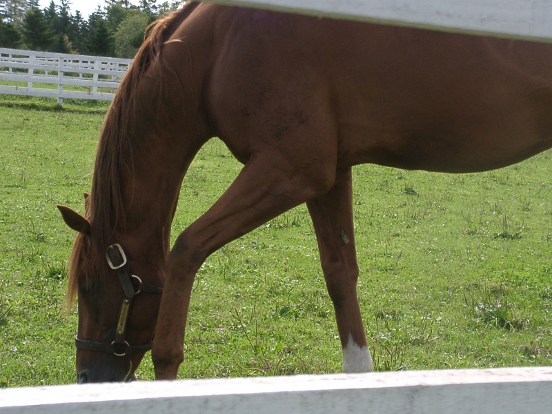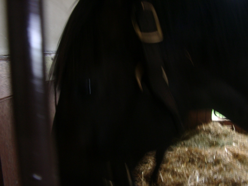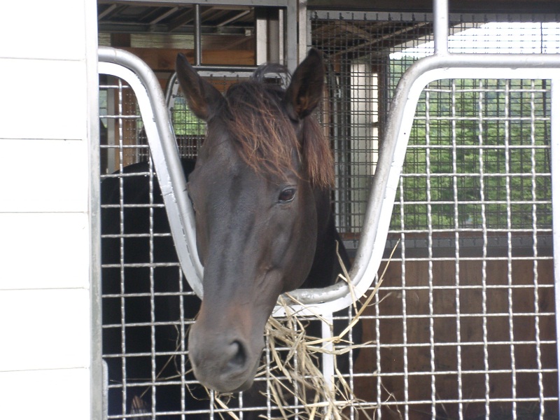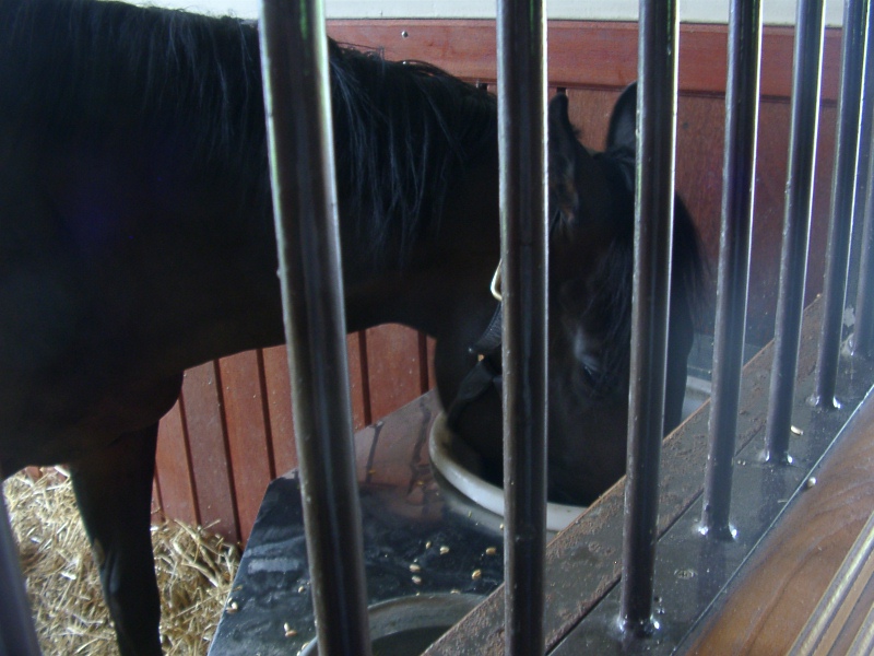 ちょうど夜間放牧の期間に当たっていたので、馬たちはみんな厩舎に入っている時間でした。りっぱな厩舎。   スパイキュール。相変わらずツメ弱いらしくて、厩舎内のボードに「砂のぼり」(蟻洞のこと)と書いてありました。