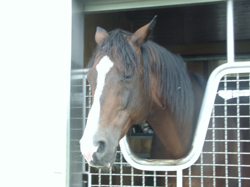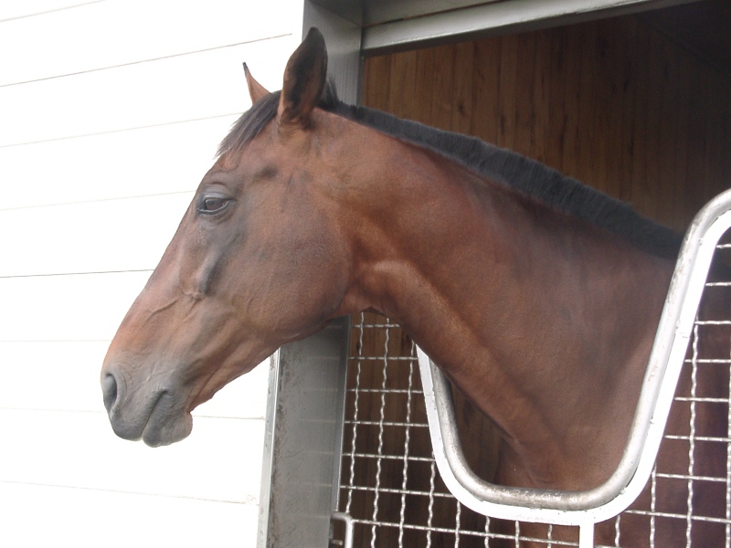 デジタルの向かい側の馬房、マイネルラヴ。こいつはキレイな顔して猛獣だった! →   ラヴが飼い桶に歯を立てて暴れる音が、厩舎内に響き渡っていました。ゼッタイ厩務員さん噛みキズだらけにしてるよ、ありゃ。